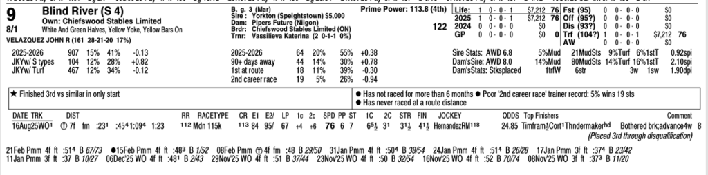 - The Jockey/Owner Factor: Hiring Hall of Famer John Velazquez for a first-time “Route” (long distance) was the ultimate signal of intent from the owners, Chiefswood Stables Limited. We know Johnny V holds a +0.82 ROI when piloting “S” type horses—he knows exactly how to get a stamina horse to the wire.