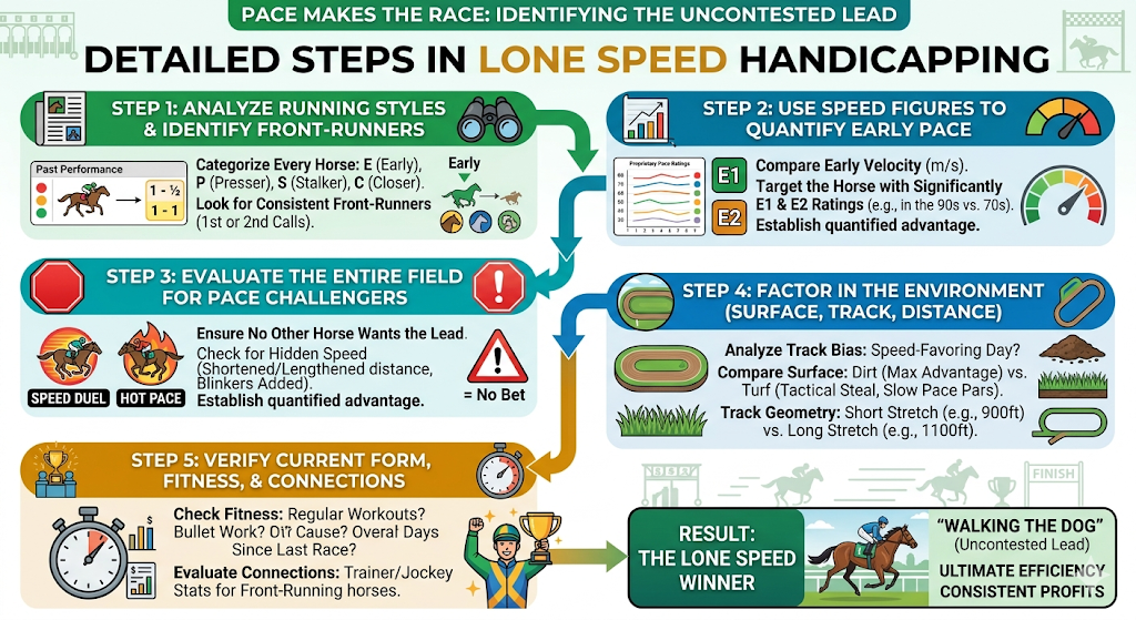 By systematically following these five steps, a handicapper can move beyond just finding the fastest horse to identifying a specific race dynamic where a solitary front-runner has a unique tactical edge, often at advantageous odds.