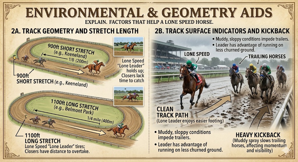 Dirt surfaces are already the most speed-favoring, but moisture often creates a “sealed” or “fast” surface that acts as a conveyor belt for front-runners.